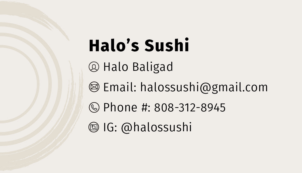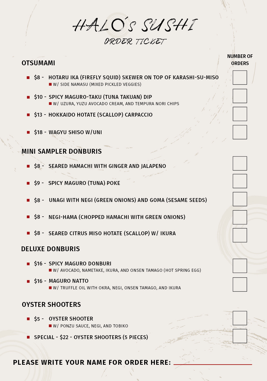 I designed a series of sushi menus, order tickets, and a business card for Sushi Chef Halo’s pop-up catering events, tailoring and updating the design for each new menu.